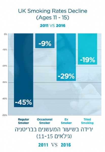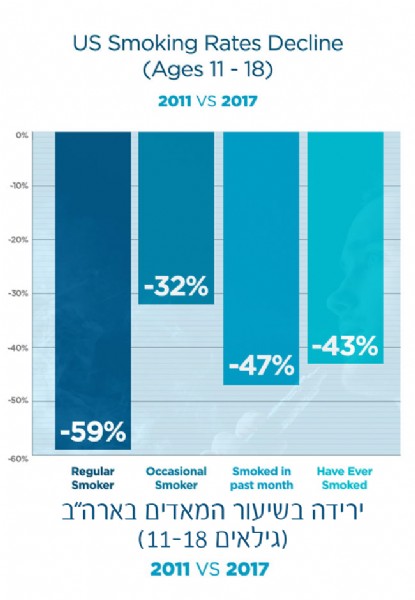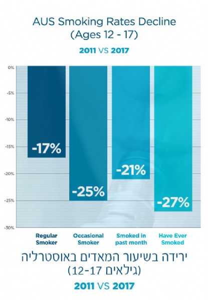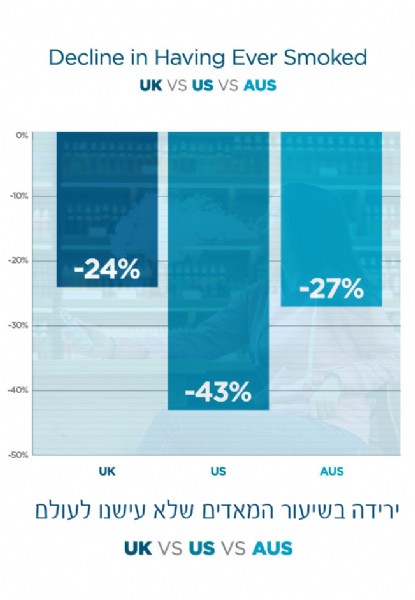 נמדד על אנשים שעישנו לפחות סיגריה בחודש, בארה"ב ראו ירידה של כ58% משנת 2011 עד ל2017, בריטניה עם ירידה של 45% מ2011 ל2016, ורק 25% באוסטרליה.